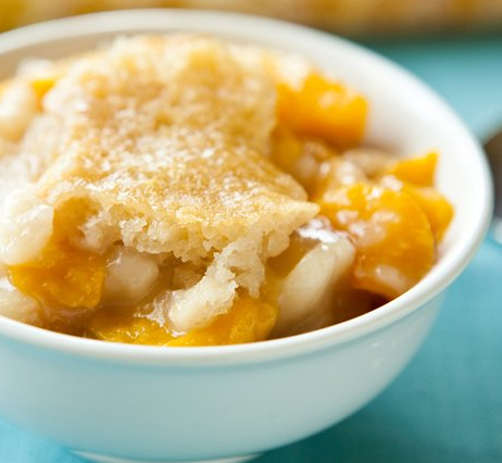 In medium bowl, gently beat Bisquick mix, sugar and milk with whisk until blended. Pour over peaches in slow cooker.