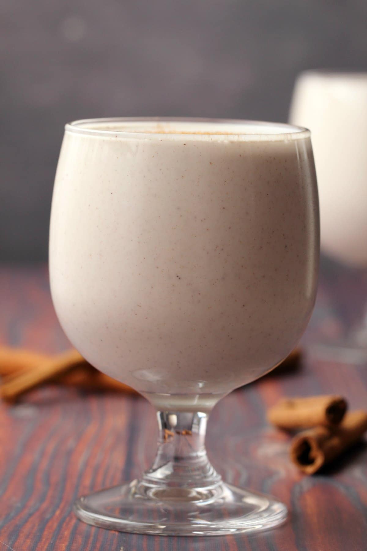 Rich, creamy and boozy vegan eggnog. This super simple recipe uses cashew nuts instead of egg to create a deliciously thick creamy (and don’t forget boozy!) drink that is perfect for the holidays.
