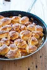 3. Combine remaining sugar and cinnamon. Break dough into rough 1-inch pieces and space them about 1/2 inch apart on top of hot peach mixture. Sprinkle with cinnamon sugar and bake until topping is golden brown and filling is thickened, 18 to 22 minutes. Let cool on wire rack for 10 minutes. Serve. (Although best eaten the day it is made to maintain the texture of the cobbles, leftovers may be refrigerated for up to 1 day. Individual portions may be removed from skillet and reheated in microwave.)