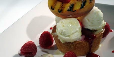 3. Place 3 small balls of ice cream, each about 15 ml (1 tablespoon), on each cake. Balance a peach half, grilled side up, on top. Drizzle with raspberry coulis and garnish with fresh raspberries.