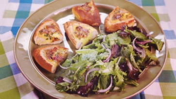 In a large mixing bowl whisk together the Eggs, Heavy Cream, Gruyere, Chives and Bacon. Season with Salt and Freshly Ground Pepper. Pour the Egg mixture into the Baguette and place in the oven. Bake for 20 minutes or until the Eggs are puffed and slightly moist in the center. The Eggs will carry-over cook for a few minutes. When cool enough to handle, cut each Baguette into 4 slices and serve.