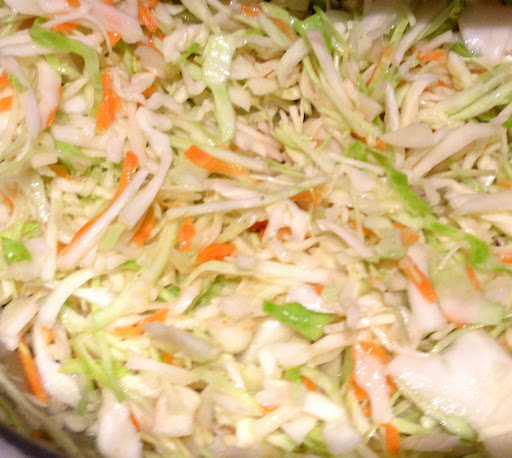 Shred carrot in food processor. Switch to thin slicer blade and slice cabbage. Mince garlic.