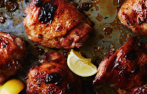 Heat oven to 450°. Remove chicken from marinade, shaking off excess, and place, skin side up, on a rimmed baking sheet. Roast until cooked through and an instant-read thermometer inserted in the thickest part of the thigh registers 165°, 25–30 minutes. Serve chicken with lemon wedges for squeezing over.