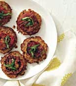 2.Position a large cast-iron skillet over the grate. Add 1 1/2 tablespoons oil and heat until hot. Working in batches, drop 1/4 cupfuls of the batter onto the skillet, leaving an inch in between. Cover and cook, turning once and pressing gently to flatten, until browned and cooked through, about 8 minutes. Drain on paper towels. Repeat with another 1 1/2 tablespoons oil and the remaining batter.