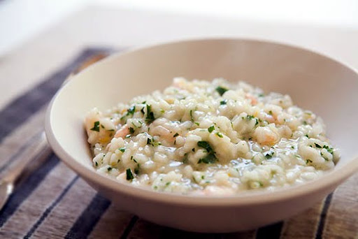 Use the smallest shrimp you can find. Try to find tiny pink shrimp in the supermarket’s freezer section. These “boreal” shrimp or Maine shrimp are uncommonly sweet and come pre-shelled and pre-cooked. Any shrimp you find larger than the last digit on your little finger should be cut in half. Risotto recipes require risotto rice, an Italian rice that has enough starch to help make the risotto's creamy sauce. Arborio rice works for this purpose, but if you can get it, use a Carnaroli rice or even better a rice called Vialone Nano, which is more delicate and creamy than the other risotto rices and is well suited for this seafood risotto.