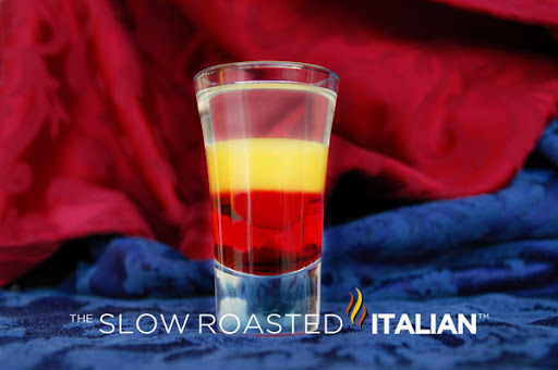 Gently pour grenadine in shot glass first. Then slowly pour in the orange juice (pour down the side of the glass to avoid mixing your layers). Slowly lower the cherry through the orange juice to rest on the grenadine. Lastly, add rum pouring it down the side of your glass.