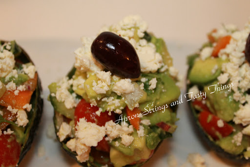 Chop the avocado into bite-sized chunks and toss together with the juice of half the lemon. Toss in the tomatoes, cucumber, peppers, onion and cilantro. Squeeze the juice from the rest of the lemon over the salad and add the olive oil and a pinch of salt. Toss all together and have a taste...add more salt if needed. Spoon the salad mixture into the shells. Top with the crumbled feta and an olive. Serve immediately. Enjoy!