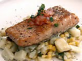 Spoon potato/corn "risotto" in center of serving plate. Top with the salmon, and garnish with chives.