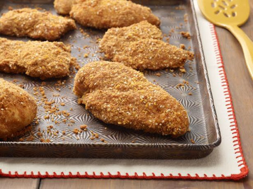 4. One at a time, dip the chicken pieces in the cracker mixture, packing crumbs onto chicken. Arrange the chicken on a baking sheet and spray lightly with olive oil cooking spray.
