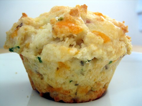 4. Make a well in the center of the dry ingredients and stir in the liquid mixture until just evenly moistened. The batter will be slightly lumpy. Spoon the batter into each muffin cup, filling it level with the rim of the cup. Sprinkle each muffin with some of the remaining cheese. Bake until golden, dry and springy to the touch, about 25-30 minutes. A toothpick inserted into the center of a muffin should come out clean. Transfer the muffin pan to a wire rack and let cool for about 5 minutes. Unmold the muffins. Serve warm or at room temperature.