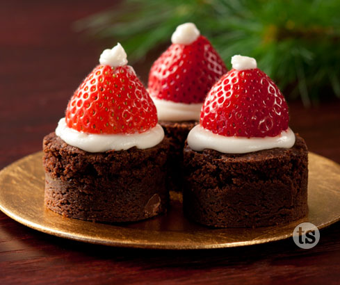 put frosting on brownie bites, top with strawberry and then frosting dot for top of hat.