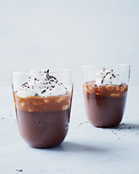 To serve, spoon the peanut-caramel sauce over the crémeux and garnish with sea salt, whipped cream and grated chocolate.