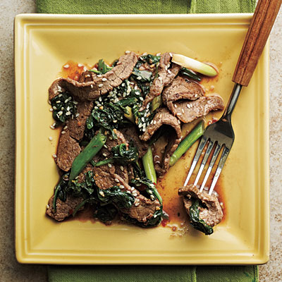 2. Heat a wok or skillet over high heat. Add oil to pan; swirl to coat. Add half of beef to pan, and cook for 3 minutes or until browned. Remove beef from pan. Repeat procedure with remaining beef. Add onions; cook for 1 minute. Add soy sauce mixture; cook 1 minute. Return beef to pan; cook 1 minute. Stir in spinach, and cook 30 seconds. Top with sesame seeds.