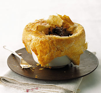Divide cooled stew among bowls (they won't be completely full). Roll out pastry dough on a lightly floured surface with a lightly floured rolling pin into a 13-inch square, about 1/8 inch thick. Trim edges and cut dough into quarters. Stir together egg and water and brush a 1-inch border of egg wash around each square. Invert 1 square over each bowl and drape, pressing sides lightly to help adhere. Brush pastry tops with some of remaining egg wash and freeze 15 minutes to thoroughly chill dough.
