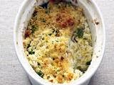 Mix 2 cups cooked rice, 1/2 cup sour cream, 1 cup chopped scallions, a 4-ounce can chopped green chiles (drained), 1 cup shredded cheddar, and salt and cayenne to taste. Butter a casserole dish and sprinkle with parmesan. Spread the rice mixture in the dish, sprinkle with more parmesan and dot with butter. Bake 20 minutes at 450 degrees.