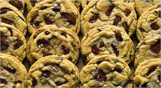 4. Scoop 6 3 1/2-ounce mounds of dough (the size of generous golf balls) onto baking sheet, making sure to turn horizontally any chocolate pieces that are poking up; it will make for a more attractive cookie. Sprinkle lightly with sea salt and bake until golden brown but still soft, 18 to 20 minutes. Transfer sheet to a wire rack for 10 minutes, then slip cookies onto another rack to cool a bit more. Repeat with remaining dough, or reserve dough, refrigerated, for baking remaining batches the next day. Eat warm, with a big napkin.
