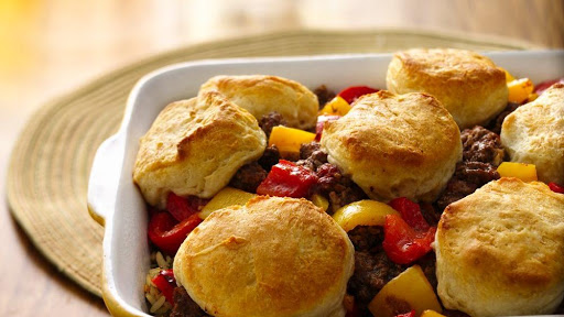 Separate dough into 10 biscuits. Spread cooked rice evenly in bottom of baking dish. Spoon hot beef mixture over rice. Top with biscuits. Bake immediately to ensure that bottoms of biscuits bake completely.