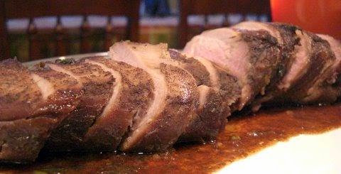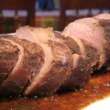 Simple delicious weeknight meal with this marinated pork loin that is then baked. Marinated for 6-24 hours, so plan ahead. Serve with baked potatoes and put them in the oven at the same time - they'll be ready at the same time!