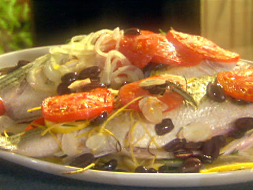 EASY BAKED STRIPED BASS WITH TOMATOES, ROSEMARY AND OLIVES