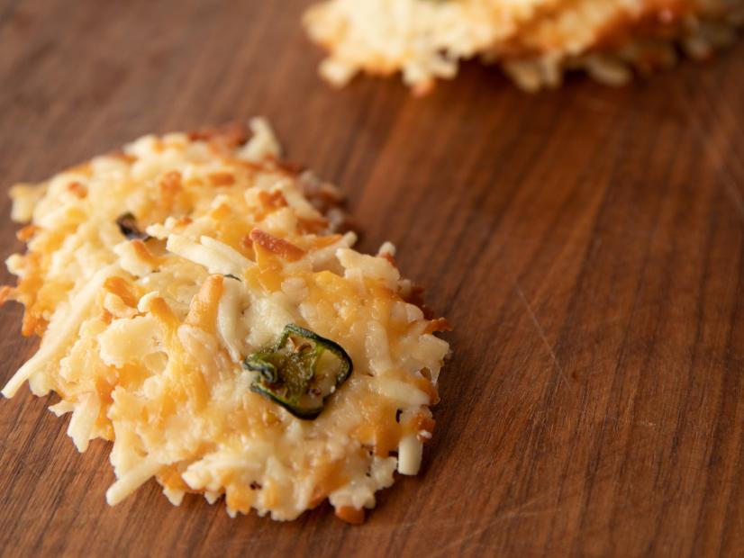 Using a tablespoon measure, spoon mounds of the cheese mixture onto the lined baking sheets, 1 to 1 1/2 inches apart from each other. Press a jalapeño slice into the center of each mound. Bake until golden and crisp, 10 to 12 minutes.
