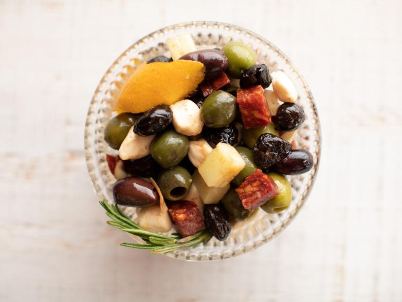 Add the mozzarella, manchego, garlic, rosemary, bay and orange peel to a large bowl, pour over the marinade and then toss. Add the olives, stirring to make sure they are covered in the marinade. Cover and refrigerate for 8 hours or overnight.