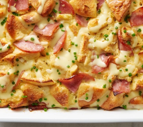 Meanwhile, make hollandaise sauce as directed on package. Pour over top of casserole. Sprinkle with chives.