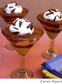 1. Scoop 1/4 cup of the coffee mousse into an oversize martini glass or l6-ounce parfait glass. Scatter a tablespoon of crumbled brownie bits on top, then place 1/4 cup of the chocolate mousse over the brownies. Repeat the layers until the top of the glass is reached. Fill another three glasses in the same manner. Cover with plastic wrap and chill for at least 2 hours, or up to 48 hours, before serving.