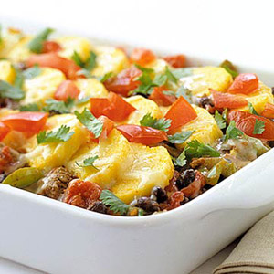 Meanwhile, grease a 3-quart rectangular baking dish with the remaining 1 tablespoon oil. Cut 1 tube of polenta into 1/2-inch cubes and press evenly into prepared baking dish. Halve remaining polenta lengthwise and cut into 1/2-inch-thick slices; set aside. Sprinkle 1 cup of the cheese over polenta in dish. Top with meat mixture. Arrange sliced polenta over meat; sprinkle with remaining cheese and fresh tomato. Bake, uncovered, for 35 minutes or until bubbly. Sprinkle with cilantro. Let stand 15 to 20 minutes before serving. Makes 12 servings.