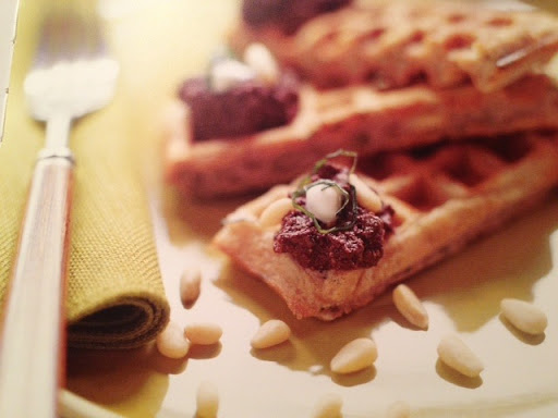 Spoon or pour about 1 cup batter onto the hot iron, Close the lid. Bake until the waffle is golden brown, about 4 minutes, Remove with a fork to a warm plate. Serve at once or keep warm on a baking sheet in a 200-degree oven. Repeat with the remaining batter. Top with a spoonful of Tapenade, creme fraiche or sour cream, and garnish with chopped basil.