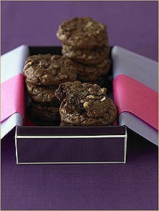 In double boiler over hot water, melt bittersweet chocolate chips and butter. In large bowl with electric mixer or whisk, beat eggs and sugar until thick; stir into chocolate mixture. In small bowl, stir together flour and baking powder; stir into chocolate mixture. Gently mix in semi-sweet chocolate chips and walnuts. Using a sheet of plastic wrap, form dough into two logs, each 2 inches in diameter and about 12 inches long. As dough will be quite soft, use plastic wrap to hold dough in log shape. Wrap tightly; refrigerate at least 1 hour or until firm. Heat oven to 375°F. Unwrap dough; with sharp knife, cut into 3/4-inch slices. Place slices 1 1/2 inches apart on greased or parchment-lined cookie sheet.