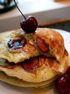 3)Heat pan till medium/hot. If not using a non-stick pan melt a small amount of unsalted butter in the pan. Use a dessert spoon to blob some of the mixture in the pan. Sprinkle some of the cherries over the batter surface. Wait until you see bubbles appear on the surface. Flip over. Cook until golden brown and risen to about 1 cm.
