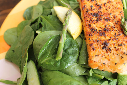 Spinach and Arugula with Pan Seared Lemon Salmon and Asparagus