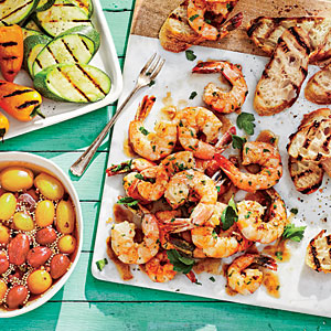 In small bowl combine first five ingred. set aside 1/4 c . Thread shrimp onto 8 metal or soaked wooden skewers. Grill shrimp, covered, med heat 3-5 min on each side or til turns pink. basting occasionally with butter mix. Remove from grill; brush with reserved butter mix.