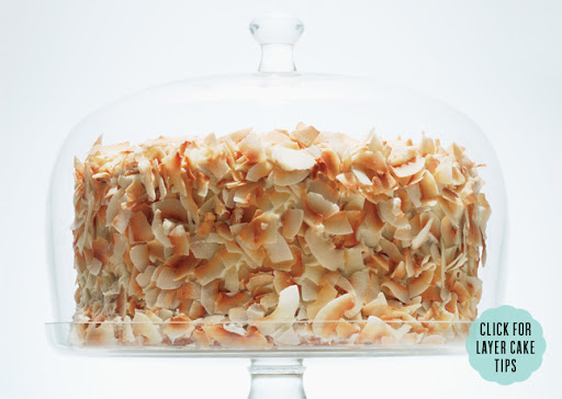 Gently pat handfuls of toasted coconut chips over sides and top of cake and serve.