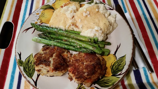 Heat 2 T. olive oil and 1 T. butter in skillet on med-high heat (4-5 on electric stovetop). Fry crab cakes until brown on both sides.