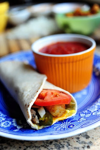 To assemble, add ingredients to the middle 1/3 of a warm tortilla in this order: cheese, eggs, sausage, tater tots, chopped onion, jalapeno, and tomato slices. Wrap one side of the tortilla, then the other. Wrap burrito tightly in a square of foil and keep warm. Reheat in the oven if necessary.