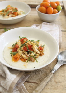 It’s the collision of total comfort food and the end of summer. Sherry wine sauteed fresh garden cherry tomatoes are tossed with basil and shredded chicken for a quick topping and served over these creamy goat cheese grits.