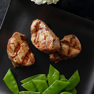 Crisp on the outside and buttery-tender on the inside, these sweet and spicy soy sauce-marinated pork tenderloin medallions make for a delicious, healthful and elegant entree. Serve with snow peas, brown rice and Sour Mango Salad on the side.