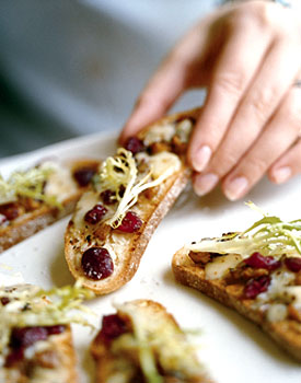 If your Thanksgiving dinner is a formal affair, serve the crostini on small plates with the frisée salad. If your guests like to hang out in the kitchen until dinner is served, offer the crostini as passed hors d'oeuvres topped with a sprig of dressed frisée.