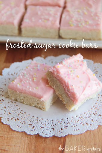 To make the frosting, beat together the butter, powdered sugar, and half and half until light and fluffy. Add the vanilla, salt, and food coloring, and beat again until fluffy. Spread over cooled cookies and add sprinkles. Cut into squares (I did 24 squares, but you can make them as big or small as you would like). Enjoy!