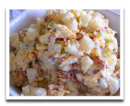 4. Add bacon, onion, and cheese to the potatoes. Mix gently. Stir in the dressing mixture.