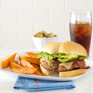 Top with cheese; cover and cook 30 seconds longer or until cheese is melted. Serve on buns with bacon and lettuce.