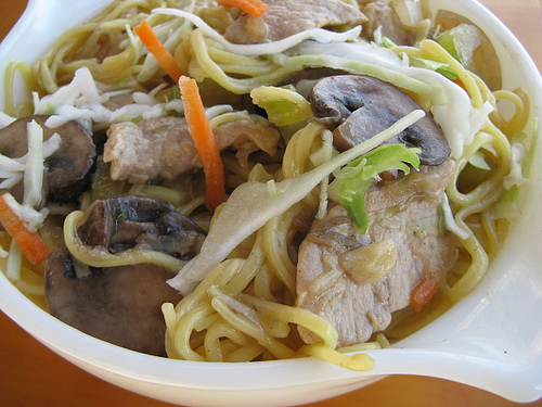 Step 1: Cook the chow Mein noodles according the package directions. Meanwhile, add a little bit of oil to the wok. Add pork strips and garlic and stir fry until fully cooked. Remove from the wok and set aside.