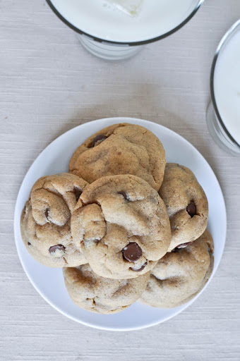 Mix the flour and baking soda in a bowl and set aside. In another bowl, mix the cooled butter/peanut butter and sugars until they are combined. Add the egg, egg yolk, and vanilla and stir until mixed. Gradually add flour and mix until a dough forms – it will look crumbly at first, but it will come together. I even used my hands to bring it all together. If necessary, add 1-2 teaspoons of milk, but I did not need this. Fold in chocolate chips.