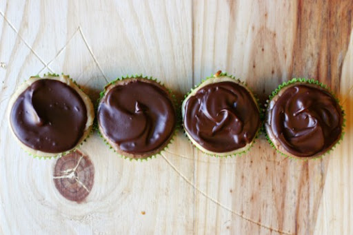 When they are cooled completely, place chocolate chips and cream in small microwave safe bowl in microwave on high in 30 second intervals, stirring after each interval, until smooth. Spoon the chocolate on top of each cheesecake.