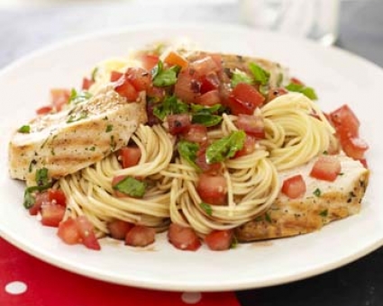 Combine the tomatoes, basil, garlic, and olive oil in a bowl and season with salt and pepper. Divide the chicken among 4 plates and top with some of the pasta. Scatter the tomato mixture over the pasta. Drizzle the vinegar over the tomatoes and sprinkle with Parmesan. Serve immediately.