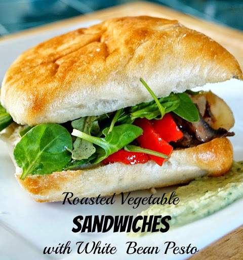 Assemble sandwiches with bean spread, roasted vegetables and spinach.