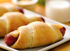 2. Separate dough into triangles. Wrap dough triangle around each hot dog. Place on ungreased cookie sheet, cheese side up.