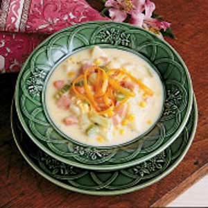 3. Add cheese and stir until melted. Stir into the undrained vegetables; return large saucepan to the heat. Add corn and ham; heat through, stirring occasionally. Yield: 6-8 servings (2 quarts).