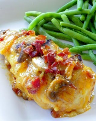 In the same skillet, saute mushrooms in butter until tender. Spoon reserved marinade over chicken. Top with cheeses and mushrooms. Place bacon strips in a crisscross pattern over chicken.